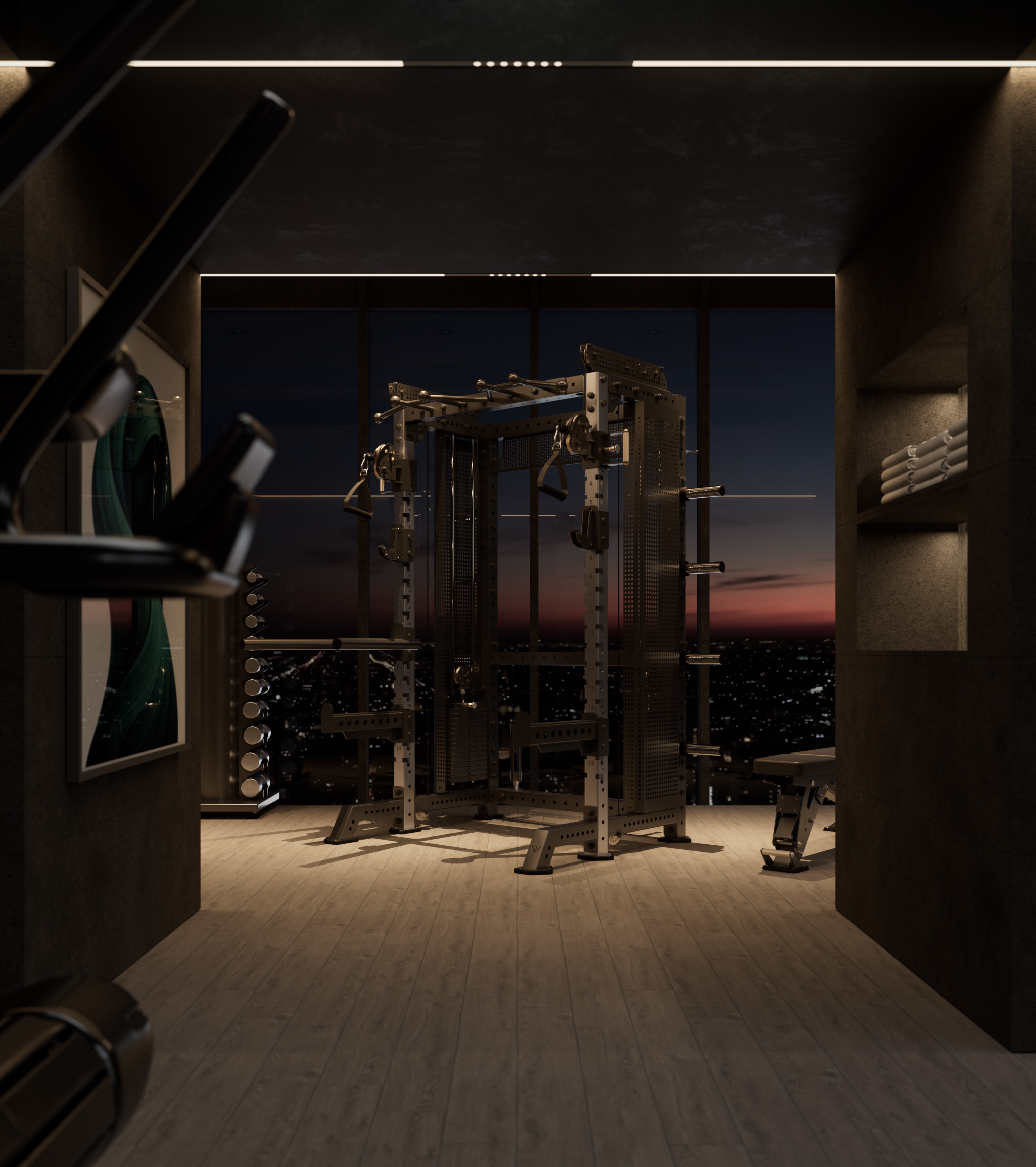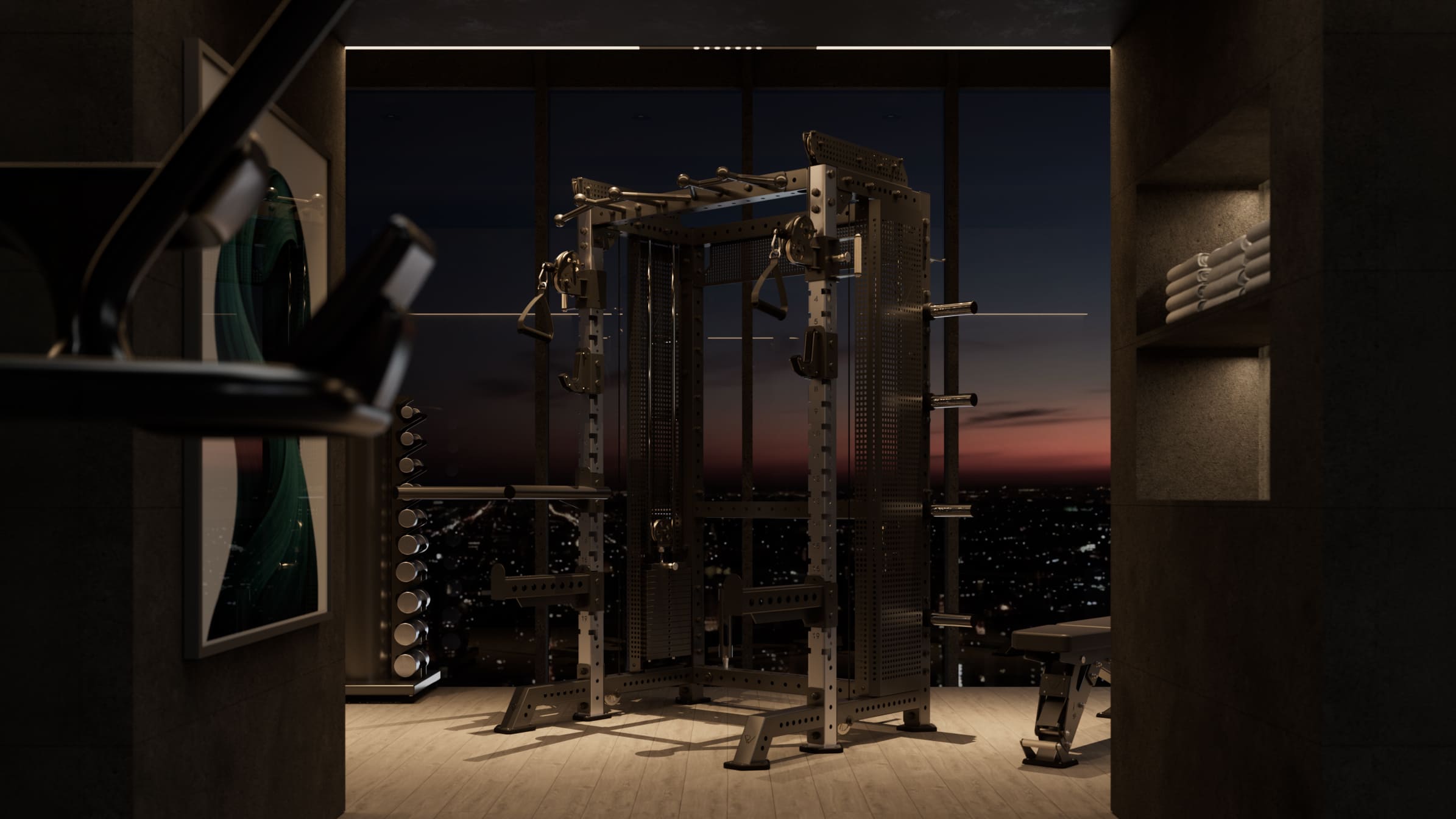 床面積を占めることなくバーベルを垂直に収納可能。